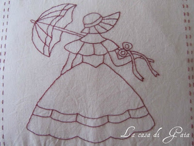 1. Questa bella damina sembra abbia voluto portare con se l'ombrellino per ripararsi dal sole,per non sciupare la sua pelle lattea mentre poggia i suoi dolci piediniin un bel prato fiorito!Questo cuscino porta la primavera e la primavera è nel tuo giardino con quelle belle creature appena sbocciate!Un abbraccione,Rosetta