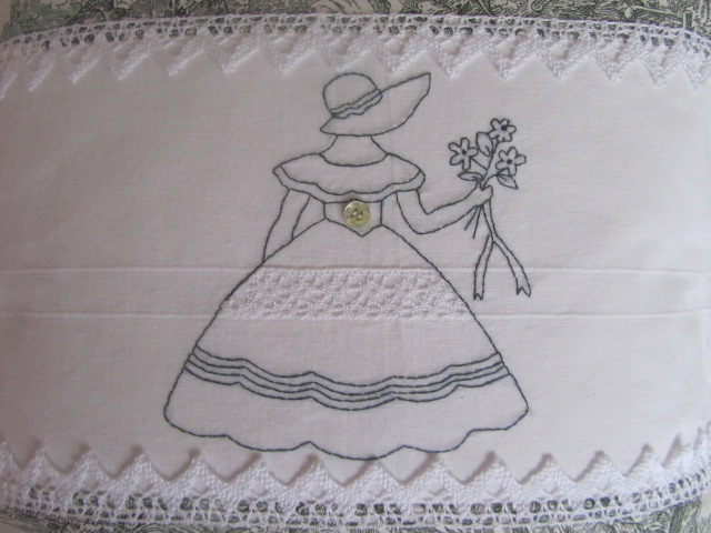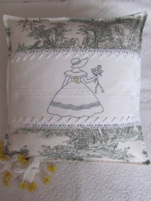 Un cuscino in Toile de jouy, tessuto che amo molto, ricamato con una damina presa da uno schema che mi ha regalato la mia cara amica Debora.
