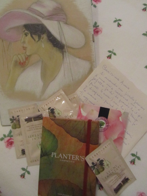 Buongiorno a tutti, dopo una settimana sono di nuovo quà....qualche giorno fa ho ricevuto un regalo veramente inaspettato...la dolce Fiore di http://volaresenzaleali.blogspot.it mi ha spedito questo meraviglioso quadro dipinto da lei....sono rimasta a bocca aperta per lo stupore e la sorpresa...è bellissimo, non sapevo dipingesse! ...e non si è limitata al quadro, mi ha pure mandato dei campioncini e delle agendine carinissime dell'Erboristeria dove lavora (un'agenda è partita per casa di Ale prima di fotografarla!)...grazie di cuore carissima amica, mi hai piacevolmente stupita e commossa! Chiedo scusa per la pessima qualità delle foto...