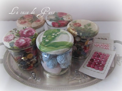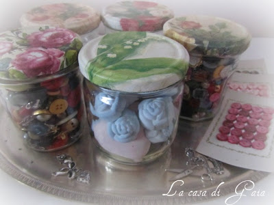 Ed infine dei vasetti da marmellata rinnovati con il decoupage! Questi li ho fatti una notte di quest'inverno...fuori c'era una bufera di neve, io e Gaia non riuscivamo a dormire e per passare il tempo e rilassarmi mi sono inventata queste decorazioni. Beh, inventata proprio no perchè poi ho scoperto che Marta http://lasmanualidadesdemarta.blogspot.it/ ne ha fatti di bellissimi pure lei...se vi prendete un pò di tempo per visitare Vania, Francy e Fla...andate anche da Marta...ricama divinamente e fa cose magnifiche!