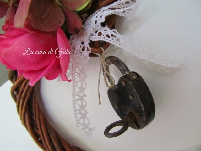 Una ghirlanda a cuore,una rosa e un'ortensia essiccata,un fiocco di pizzo ed un vecchio lucchetto a dare il benvenuto a chi arriva..poi penseremo alla ghirlanda di Natale.