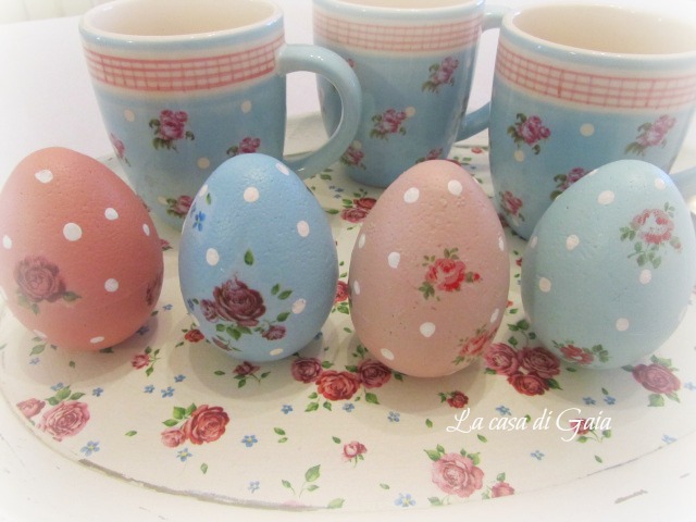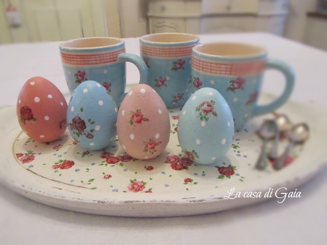 ...e visto che domenica è Pasqua, queste sono alcune delle uova di polistirolo che sto preparando per il centrotavola. L'ispirazione viene dalle mugs che ho in cucina: ho dipinto le uova con tre mani di acrilico, ho fatto i pois con il fondo del pennello, ho applicato delle roselline prese da tovaglioli da decòupage di Cath Kidston (che adoro)ed ho passato una mano di finitura satinata.