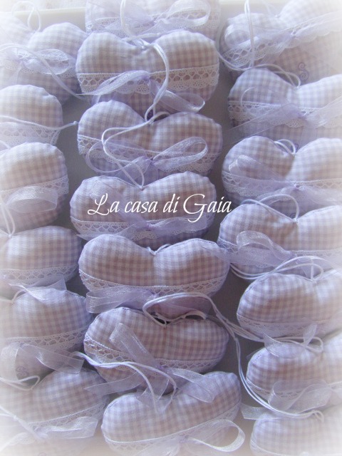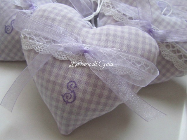 Vi mostro cosa ho preparato in questi giorni:bomboniere a cuore in stoffina vichy lilla ripiene di lavanda e con l'iniziale del nome stampata a timbro...per la Prima Comunione di Silvia, una dolce bimba di Verona.