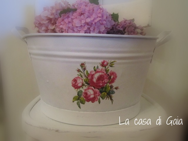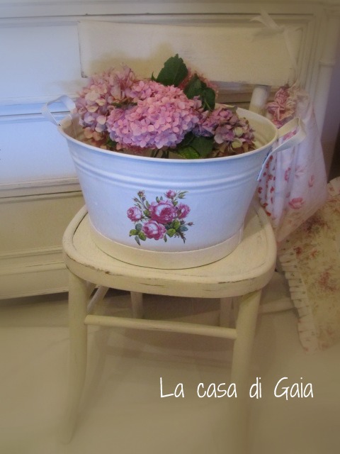 Scusate, mi sono lasciata prendere dall'argomento...vi lascio con un angolino della mia stanza, una vecchia sedia shabbata con sopra una bacinella di zinco che era troppo macchiata per lasciarla com'era quindi l'ho verniciata di bianco ed ho applicato un mazzo di rose antiche con tovagliolo da decoupage.