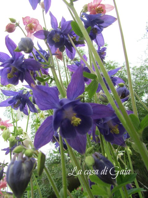 ...le aquilegie (quelle blu sono nate da semi che mi ha regalato la dolce Rosetta) la fanno da padrone assieme a mughetti,iris,glicine,rose rugose e geranio di montagna...