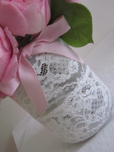 Per il vaso ho preso ispirazione da Lieta...ho semplicemente incollato ad un vasetto di vetro del pizzo Valencienne e applicato un piccolo fiocco rosa.