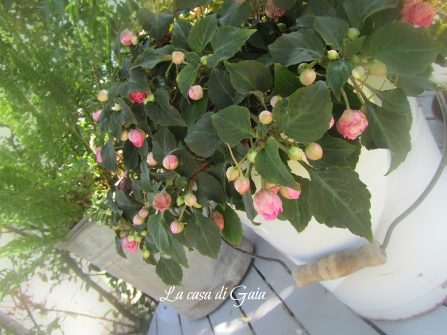 ...poi ovviamente facciamo spazio, i secchi in zinco e quello smaltato li mettiamo a terra così potete ammirare il mio meraviglioso tavolino in legno "very very shabby"...un recupero di mio genero che ha capito come ingraziarsi la suocera☺