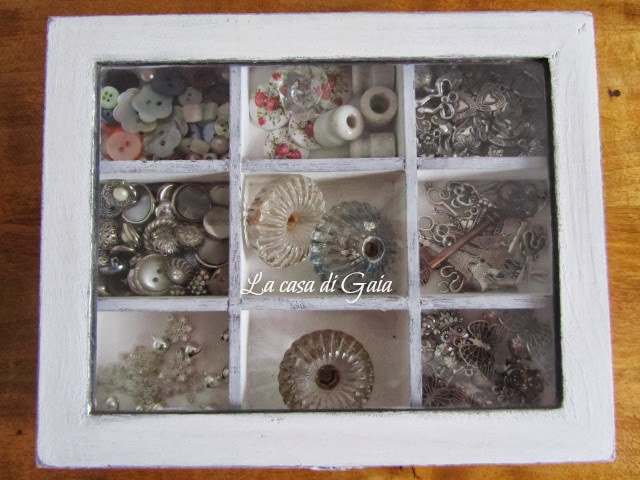 Poi finalmente ho sistemato in questa scatolina a scomparti e shabbata pure lei, alcuni dei miei "tesori"... charms, bottoni e pomelli vintage...