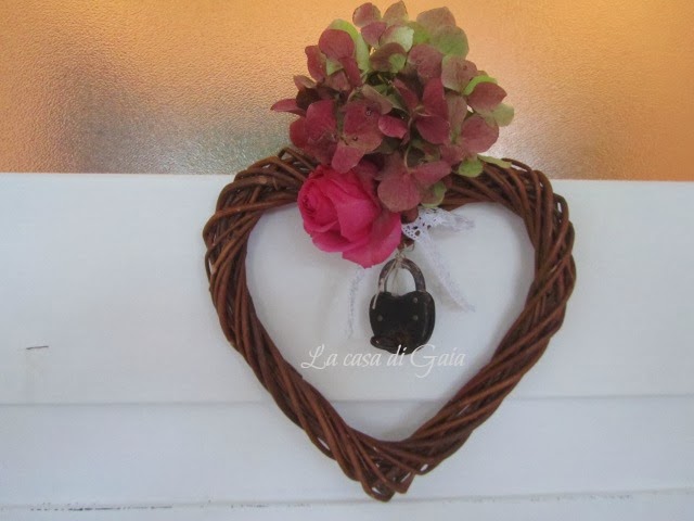Una ghirlanda a cuore,una rosa e un'ortensia essiccata,un fiocco di pizzo ed un vecchio lucchetto a dare il benvenuto a chi arriva..poi penseremo alla ghirlanda di Natale.
