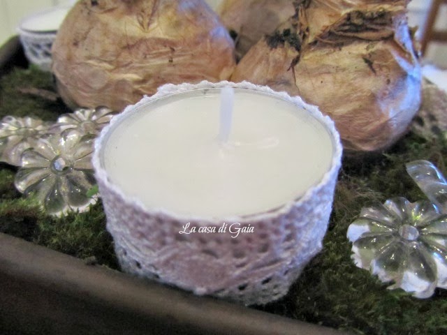 Ispirata dai blog norvegesi,ma con scarso risultato per quanto riguarda l'atmosfera,ho realizzato un semplice centrotavola utilizzando un vecchio contenitore in rame,bulbi di giacinto,muschio,mele e tealight rivestite di pizzo...una per ogni domenica dell'Avvento.