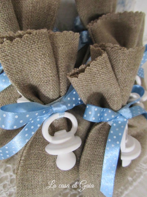 ...e sacchettini in lino grezzo con ciuccetto di gesso.