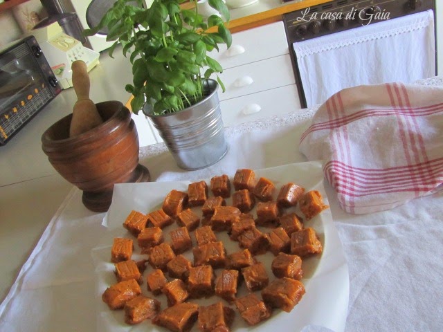 Togliere la teglia dal congelatore,rovesciare il composto congelato su un tagliere e con il coltello tagliare tanti piccoli dadi...