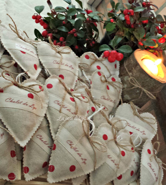 Cuori imbottiti di lavanda da appendere alle ante degli armadi di  Chalet du Lys,un meraviglioso rifugio di montagna.