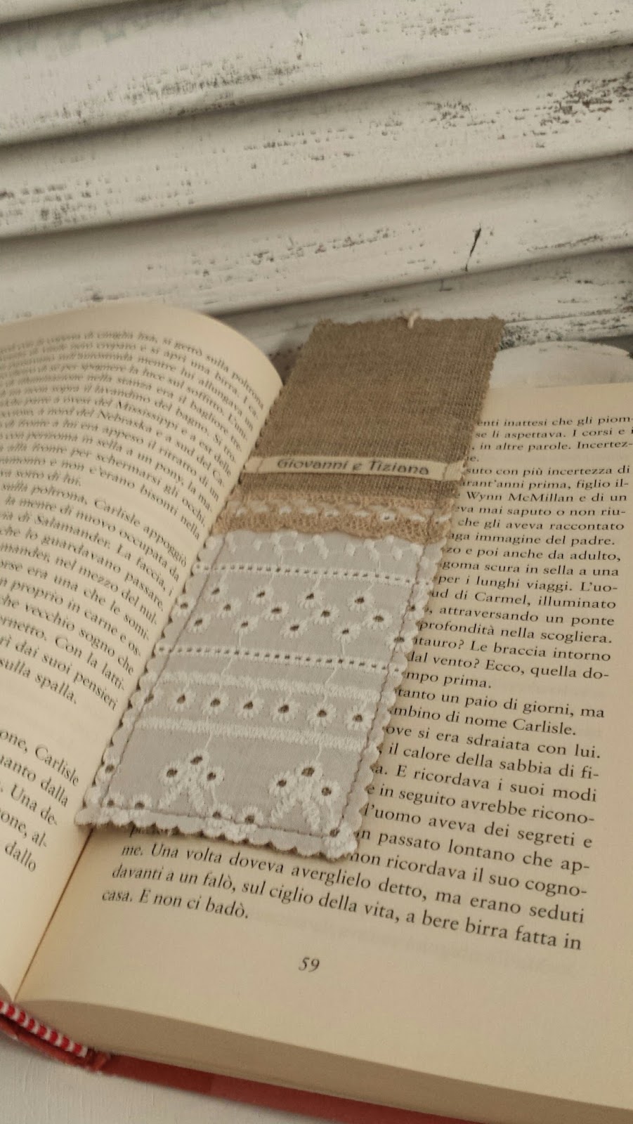 ..o quando intraprendo un nuovo lavoro con materiali naturali come il lino grezzo e il sangallo usati per i segnalibro-bomboniera di Giovanni e Tiziana