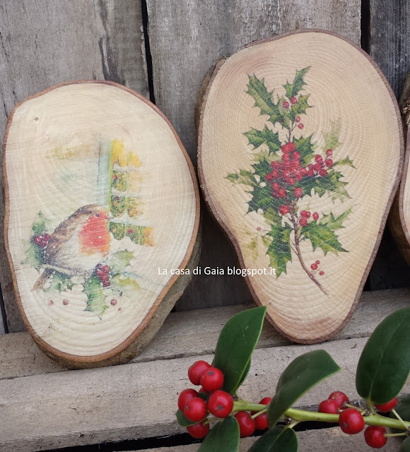 Sono rondelle di legno(cm16x14 circa)che ho decorato con stampe vintage tramite trasferimento d'immagine,levigate e lucidate con un formidabile protettivo a base di cera d'api,100% biologico,fatto con le mie mani..e l'effetto è straordinario..peccato che in foto non si veda.
