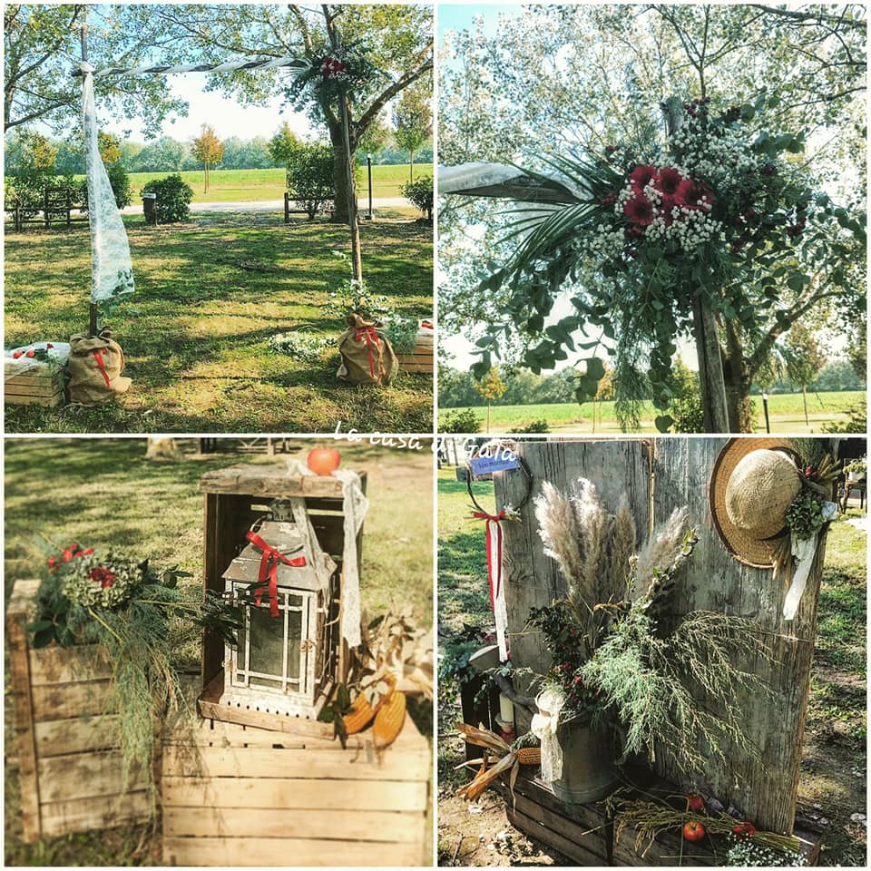 Mi spiegano che la location è immersa nel verde della campagna romagnola e che desiderano un'ambientazione a tema con un tocco di rosso e complementi vintage.